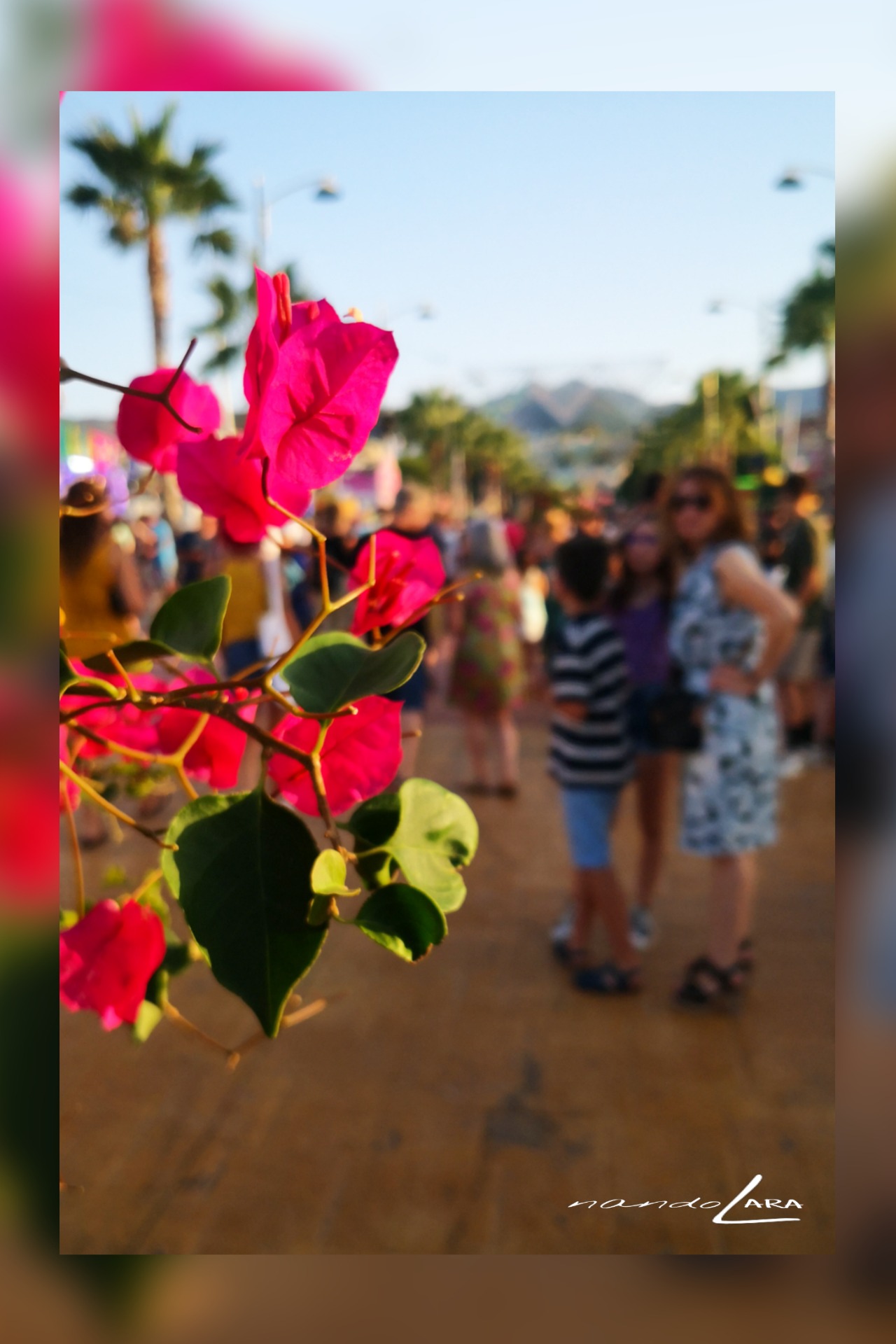 Cuando vi la foto supe que había atrapado algo más que una imagen. Era un instante detenido, una de esas pequeñas revelaciones que te da la vida sin avisar. La buganvilla parecía simbolizar la belleza que se abre sin permiso, y detrás, mi familia, mi razón de estar allí, mi verano perpetuo. Desde entonces tengo esa foto como salvapantallas de mi móvil. Fue tomada en 2023, y cada vez que la miro me devuelve el calor de aquella tarde, el olor a feria, el murmullo de la gente, y esa mezcla de alegría y melancolía que sólo da el tiempo cuando uno empieza a notar que los niños crecen demasiado deprisa.