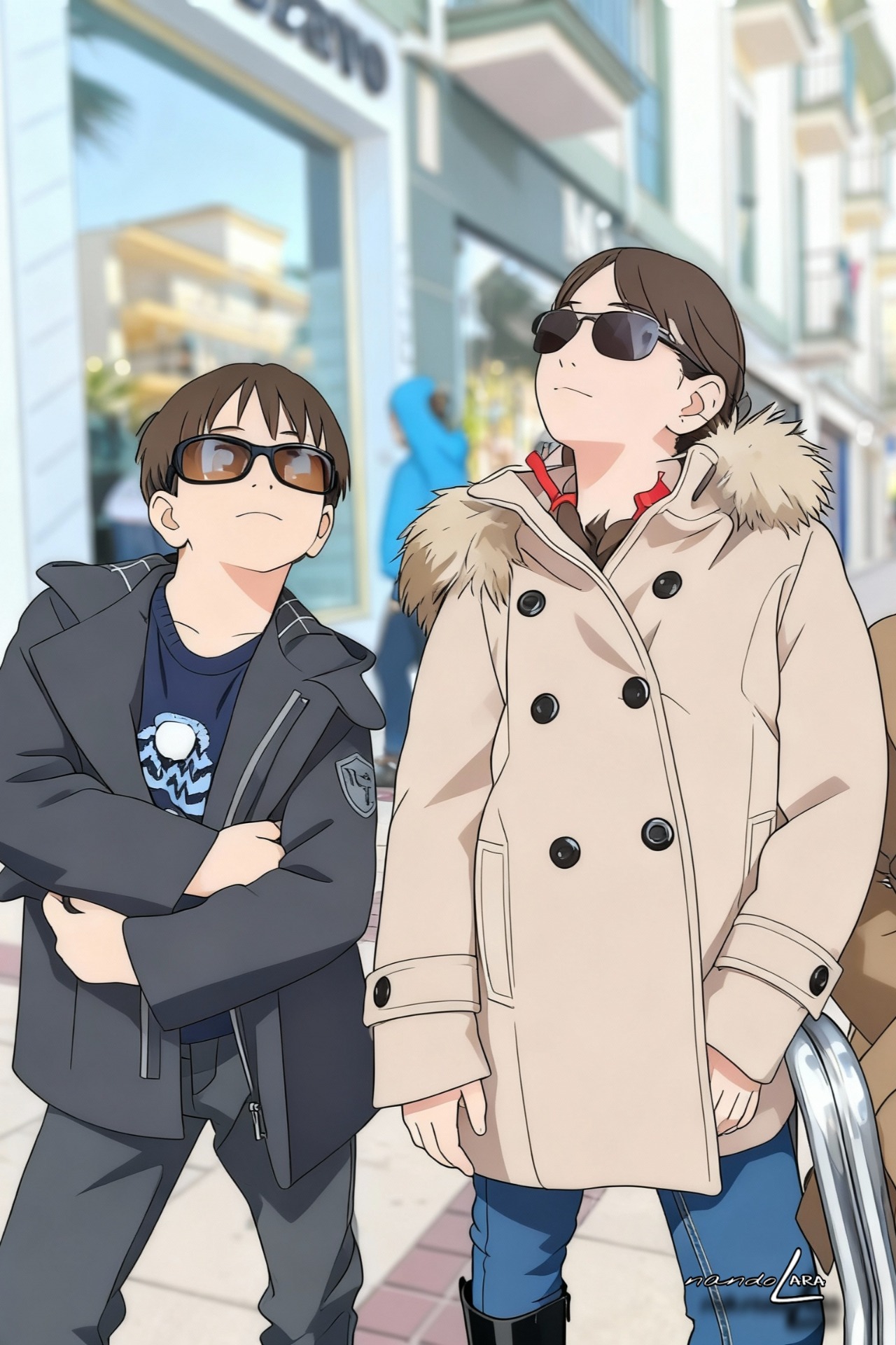 Luego vino la parte paciente, casi monástica. Ya en casa, más tarde, con la calma de un buen joyero y la obsesión de quien pule algo que ama, edité la imagen. Colores, contrastes, sombras. Poco a poco, mis hijos dejaron de parecer dos niños normales y se transformaron en personajes de manga, posando con dignidad heroica en mitad de Alhaurín. No eran caricaturas, eran versiones elevadas de sí mismos, como si hubieran sido llamados a protagonizar una historia más grande que ellos, pero sin perder la inocencia.